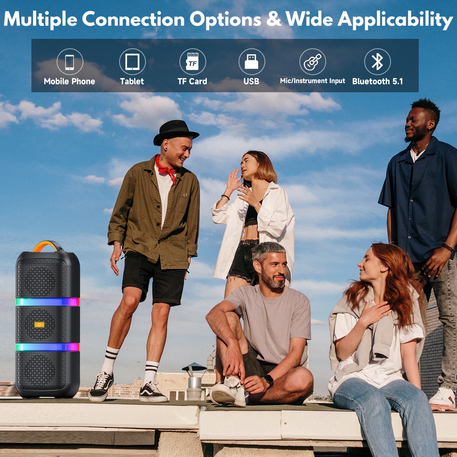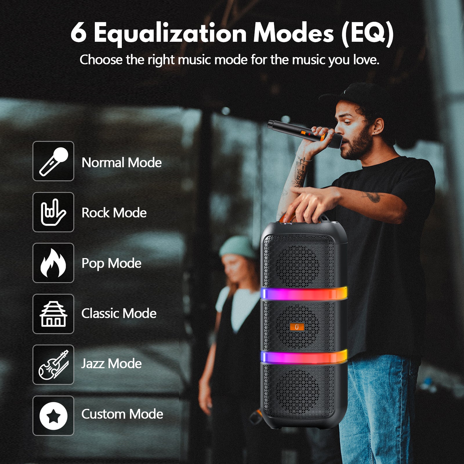 The JYX T29-T Bluetooth Speaker delivers high-volume sound and includes two wireless microphones. It supports USB, TF card, and wireless connectivity, making it versatile for any event. With RGB ambient lighting, it creates a vibrant atmosphere, perfect for outdoor use, parties, and gatherings