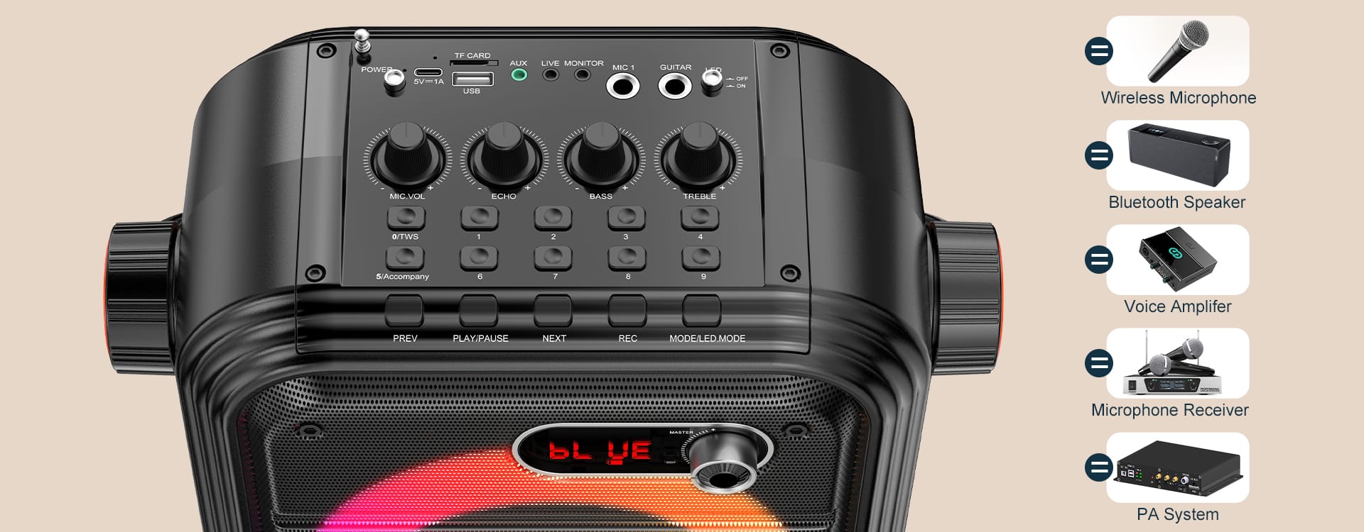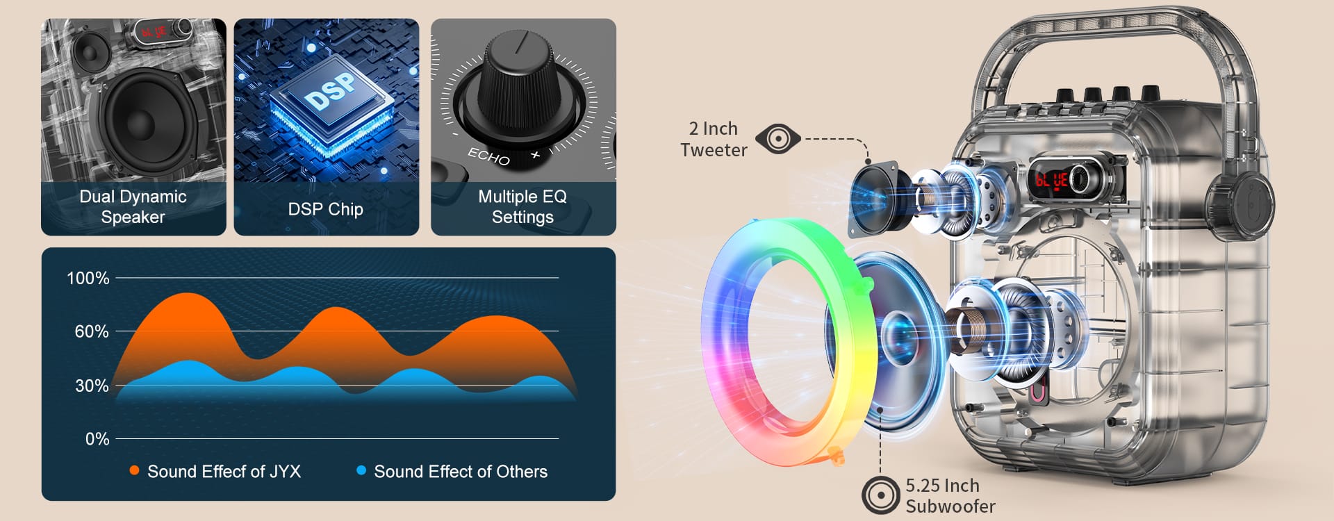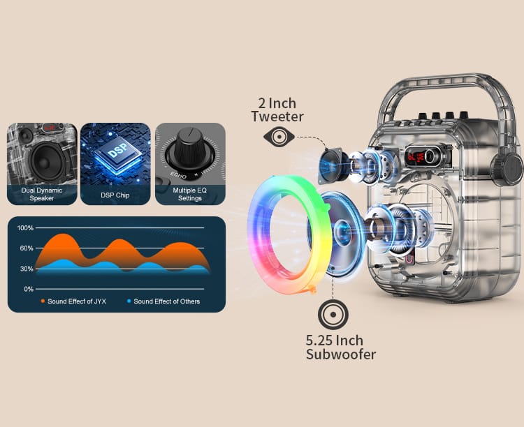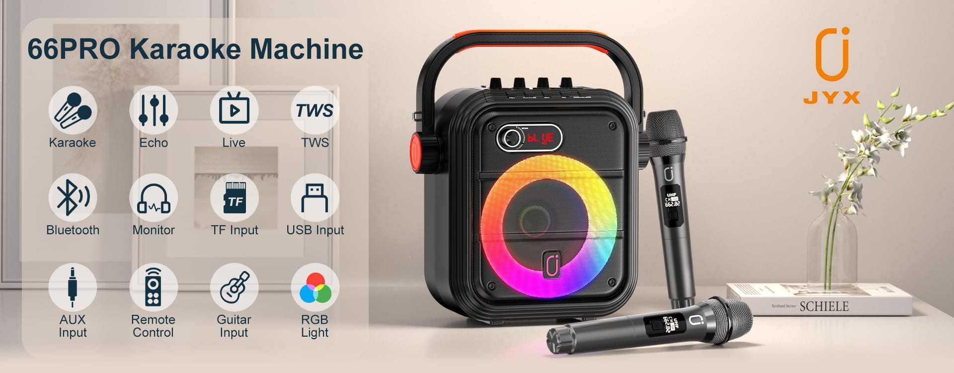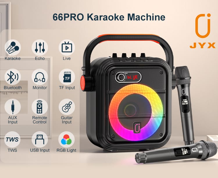 Experience the JYX 66 Pro karaoke machine captivating light display, portable design, and precise sound control. With 5200 mAh battery which offers 12 hours of playtime, and powerful stereo sound through TWS capability, it elevates your entertainment to new heights. Plus, Two wireless microphones included.
