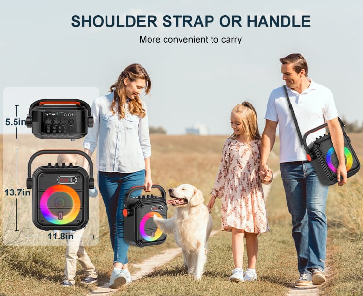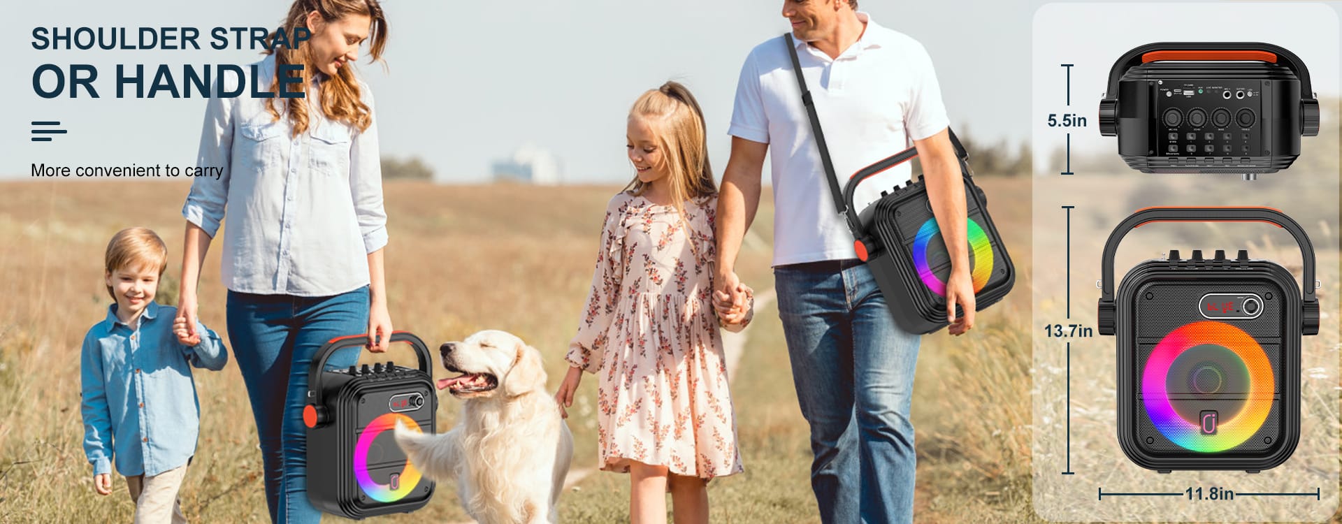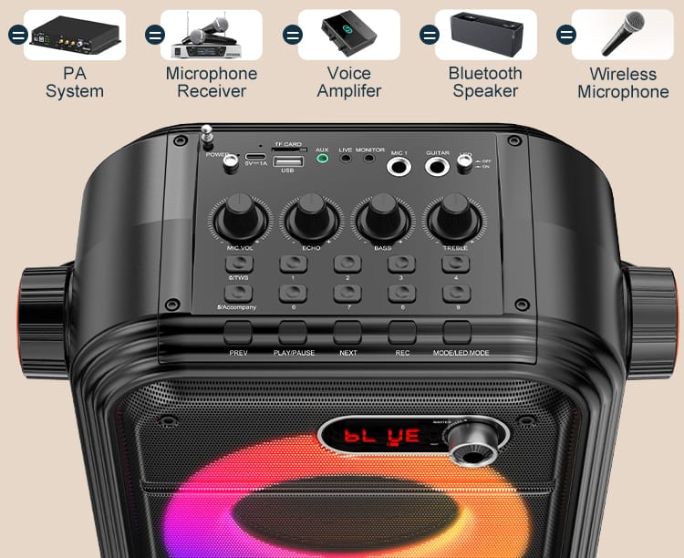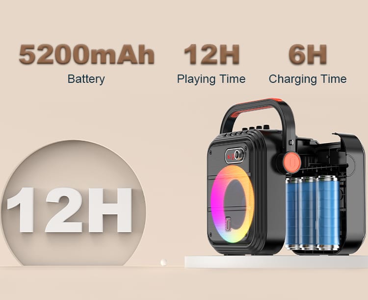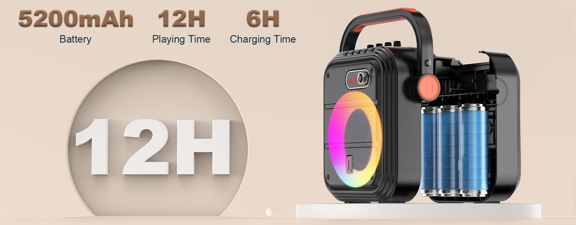 Experience the JYX 66 Pro karaoke machine captivating light display, portable design, and precise sound control. With 5200 mAh battery which offers 12 hours of playtime, and powerful stereo sound through TWS capability, it elevates your entertainment to new heights. Plus, Two wireless microphones included.