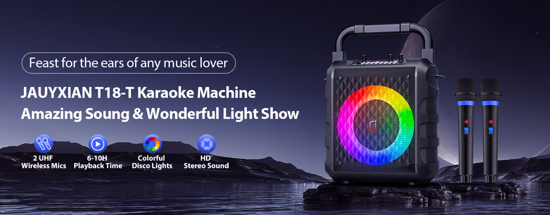 JYX T18T Home Karaoke Machine with 2 wireless microphones and 6 color lighting modes.