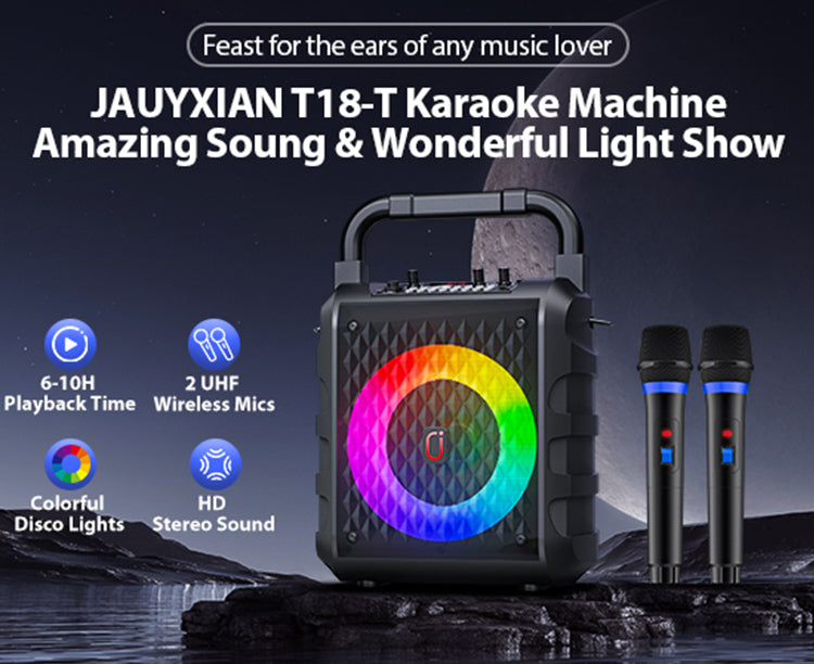JYX T18T Home Karaoke Machine with 2 wireless microphones. Suitable for classrooms, weddings, parties, and performances.