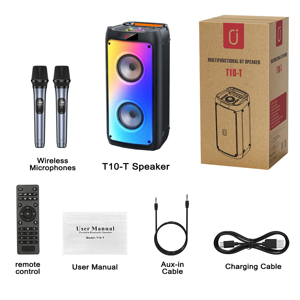 JYX Karaoke Machine T10-T comes with two wireless microphones, enjoy powerful sound and deep bass by the dual 4-inch subwoofers.
